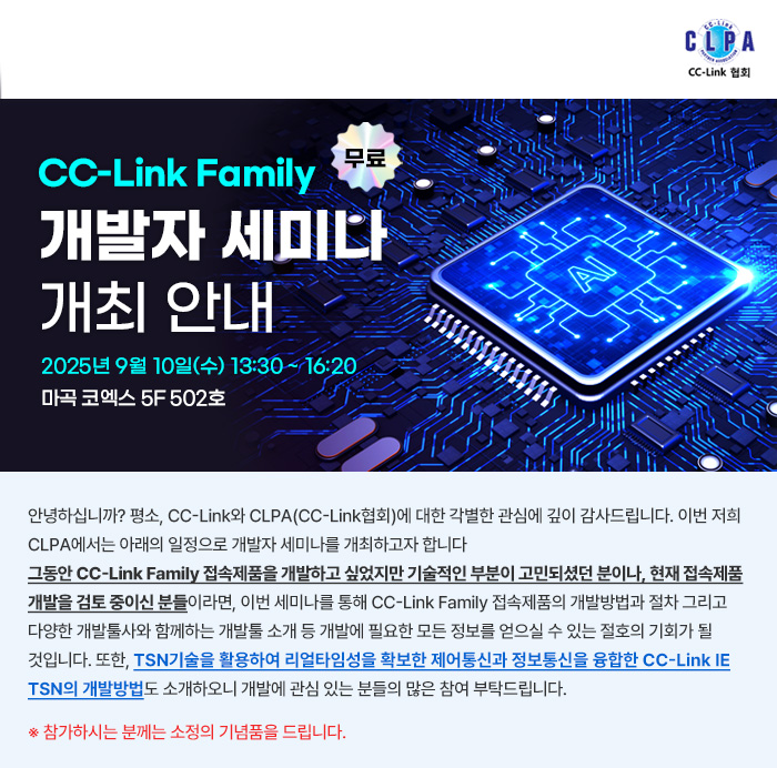 (광고) 'CC-Link Family 개발자 세미나' 개최 안내(무료) – 9/10(수)