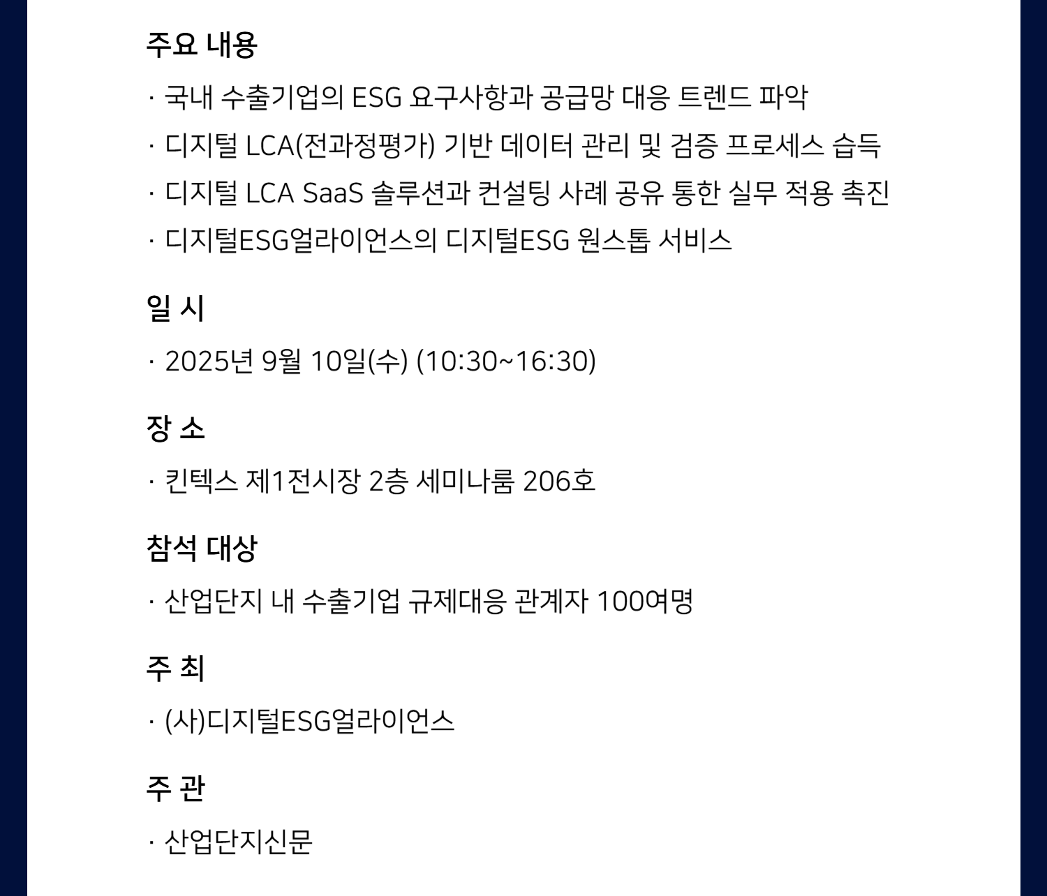 (광고) 국내 최대 산업단지 수출박람회와 함께하는 디지털 LCA 전략 세미나, 탄소규제 완벽 대비법 공개! (9월 10일)