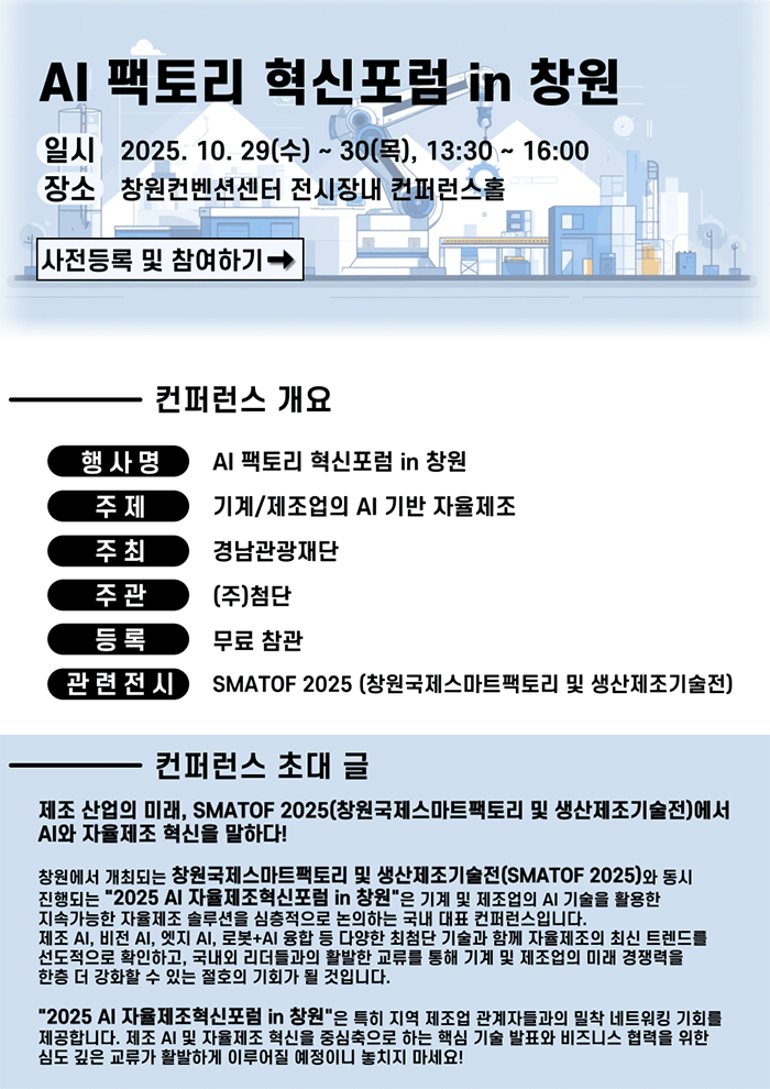 (๊ด‘๊ณ )๐Ÿค– ๊ณต์žฅ ์ž๋™ํ™” & AI ํ•ต์‹ฌ๊ธฐ์ˆ  ์ด์ •๋ฆฌ๐Ÿ’ก โ€˜AIํŒฉํ† ๋ฆฌ ํ˜์‹ ํฌ๋Ÿผ in ์ฐฝ์›โ€™ ๋ฌด๋ฃŒ ์ฐธ๊ฐ€ ์ฐฌ์Šค